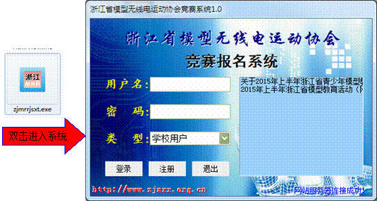 1、 参赛学校用户申请及登录:打开网上下载的压缩包,经解压缩后,双击文件 “zjmrrjsxt.exe”打开后如下图,进入系统登录界面。