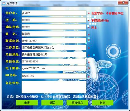 1.1申请:点击主窗口中的“注册”按钮,详细输入带*的编辑框(最好所有信息都输入,越详细越好)。输入完毕后,点击“申请”,若信息完整且正确,提示申请成功。