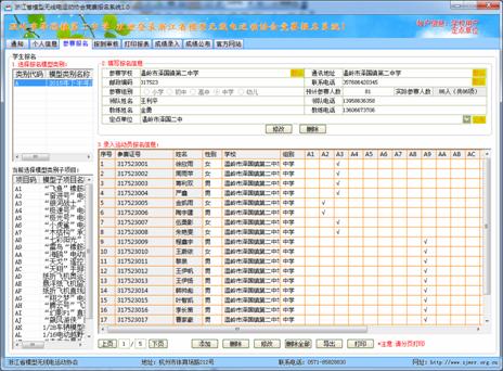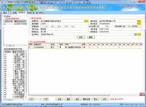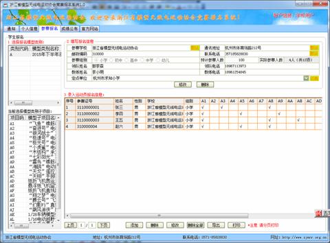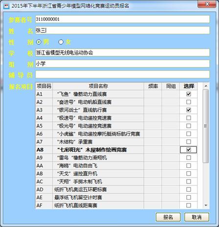 输入学生报名信息及参赛项目(带有频率的一定要填写,无同组的可不填),项目选择数据由组委会决定,系统自动处理判别。